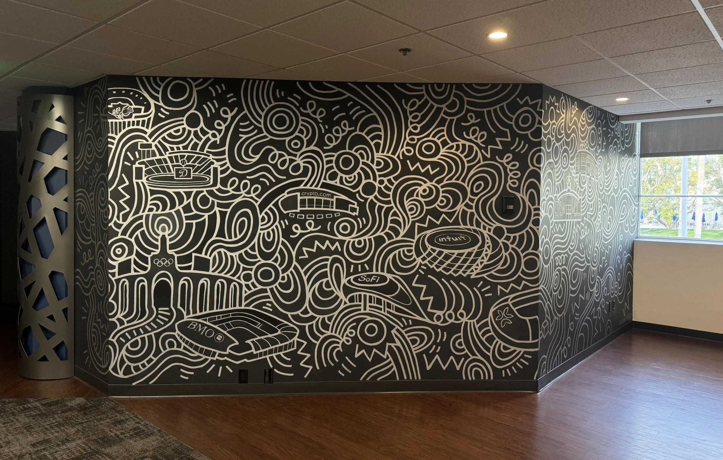 8x48 ft mural. Designed, projected, and traced over with a silver paint marker. The swooshes and swirls hide 10 of LA’s most iconic stadiums.